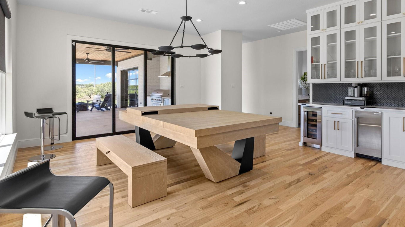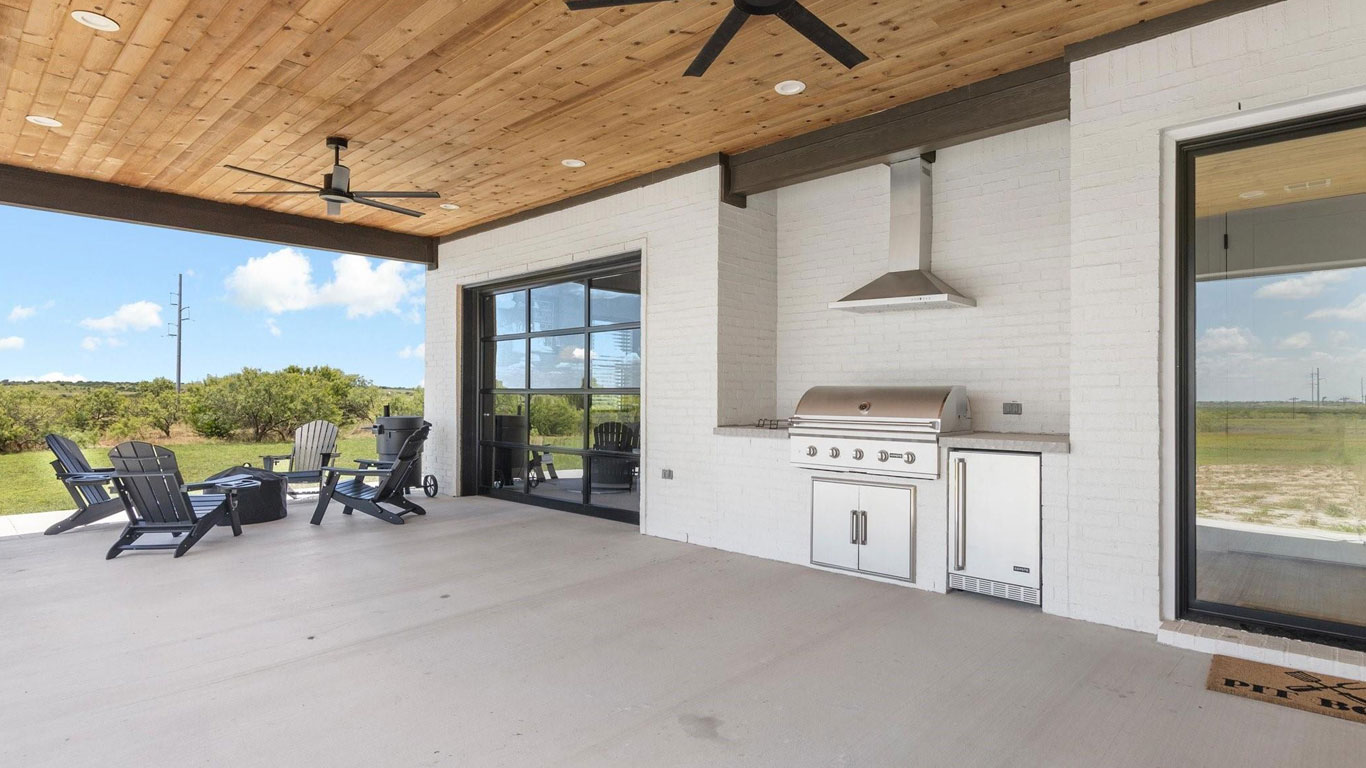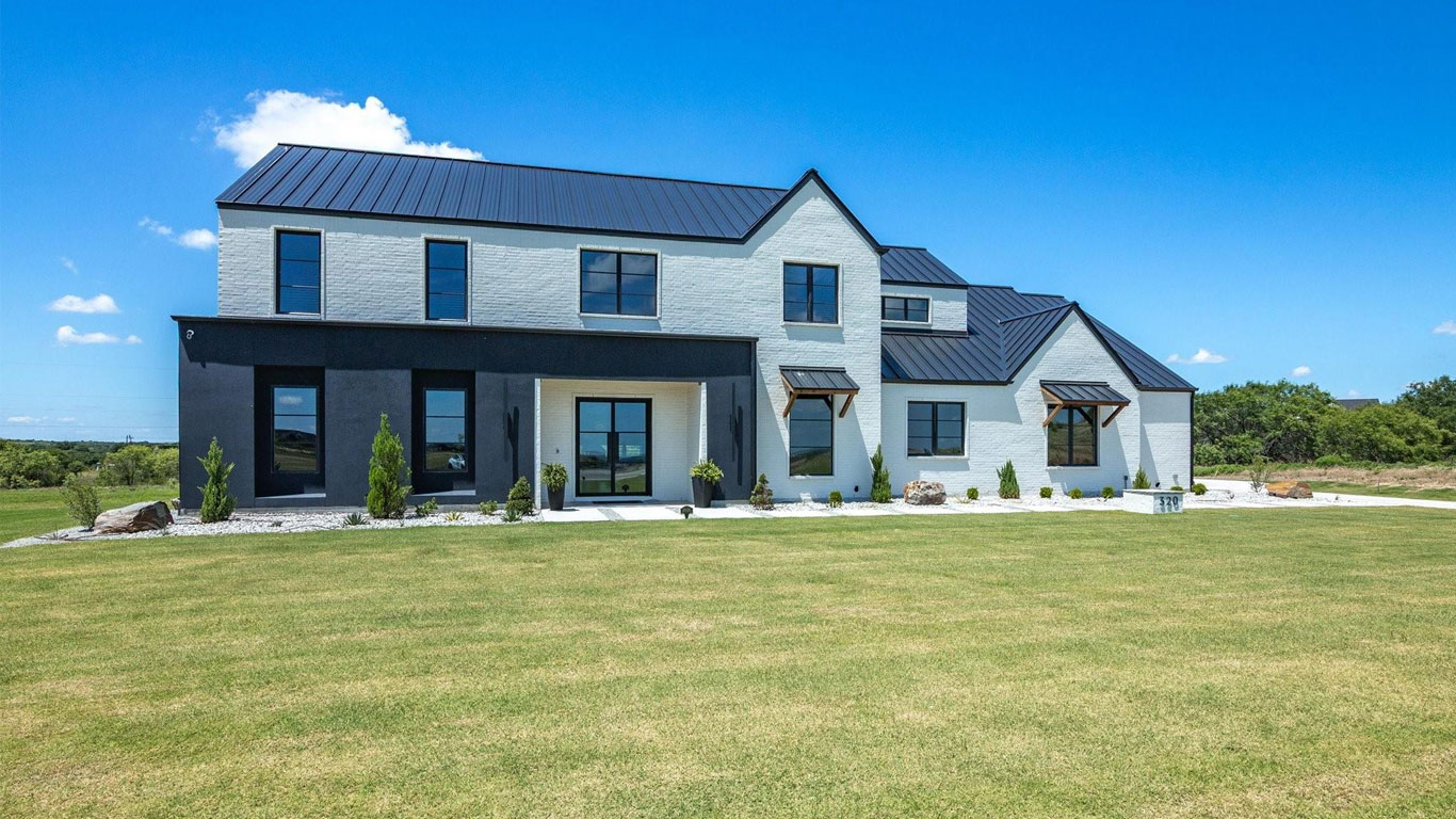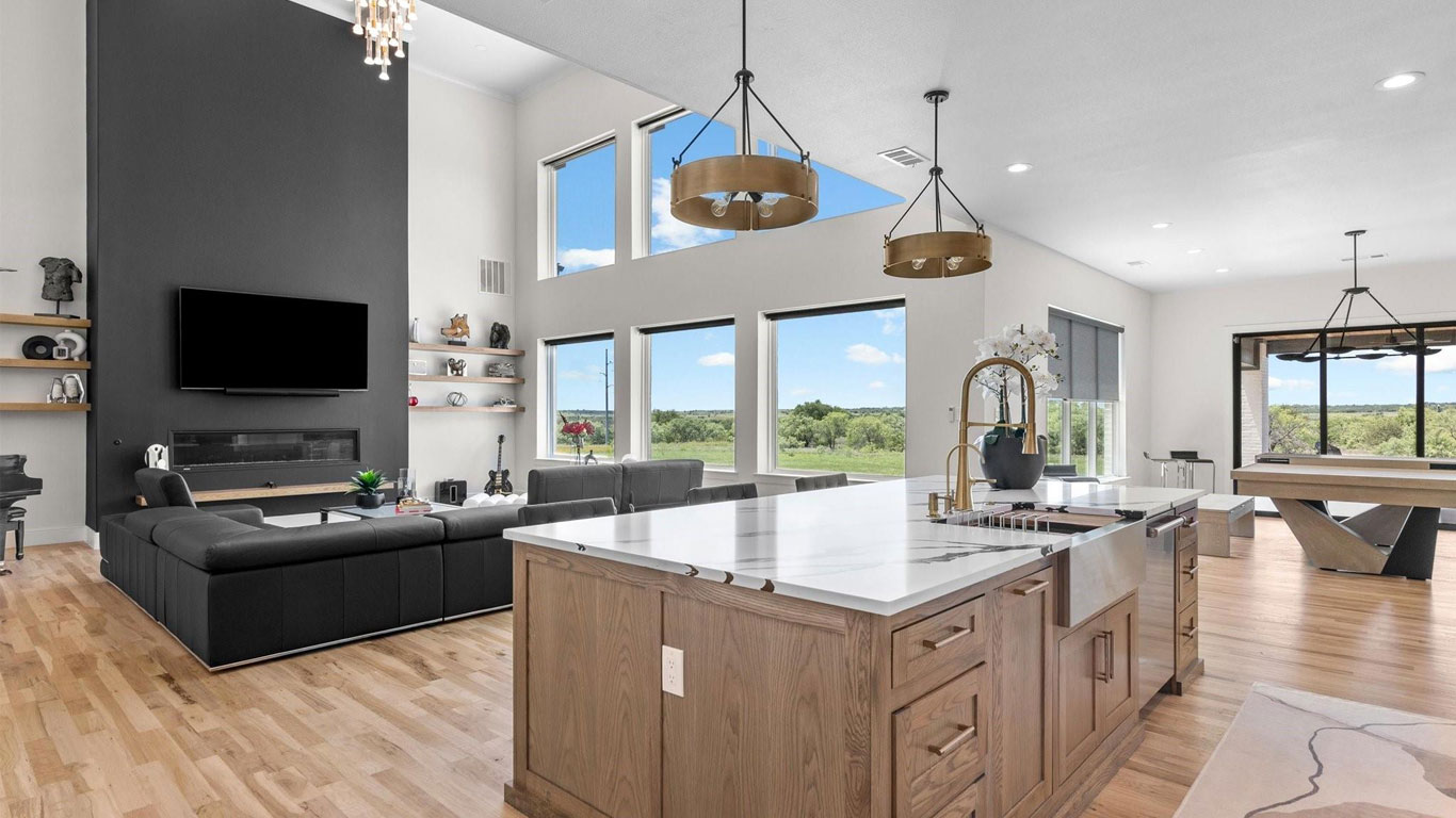 Modern rustic luxury on a 3-acre hilltop lot featuring a stunning designer kitchen, spa-style primary suite, in-home gym with indoor-outdoor bar, full media room, ensuite bedrooms, tornado-safe room, steel roof, hardwoods throughout, and four glass-door garages—all in exclusive La Madera Estates with acclaimed Aledo schools.