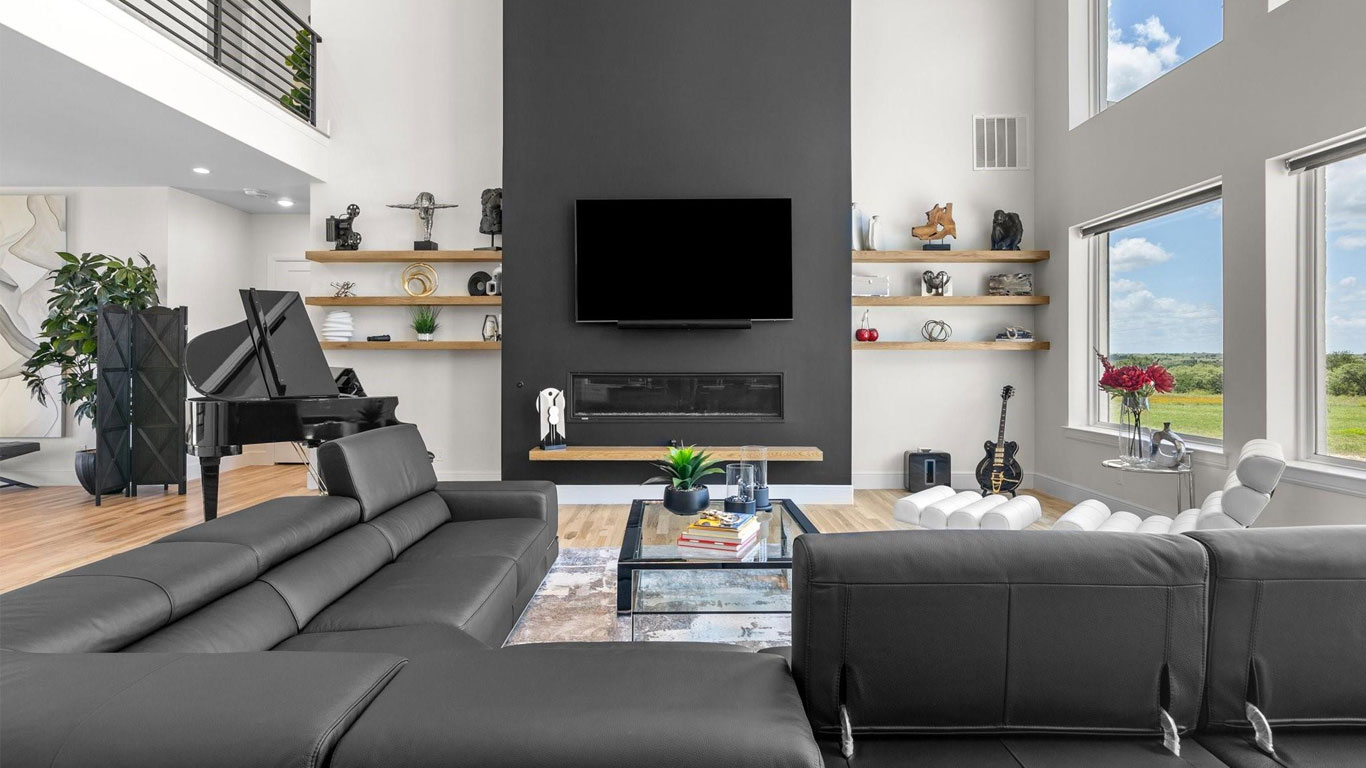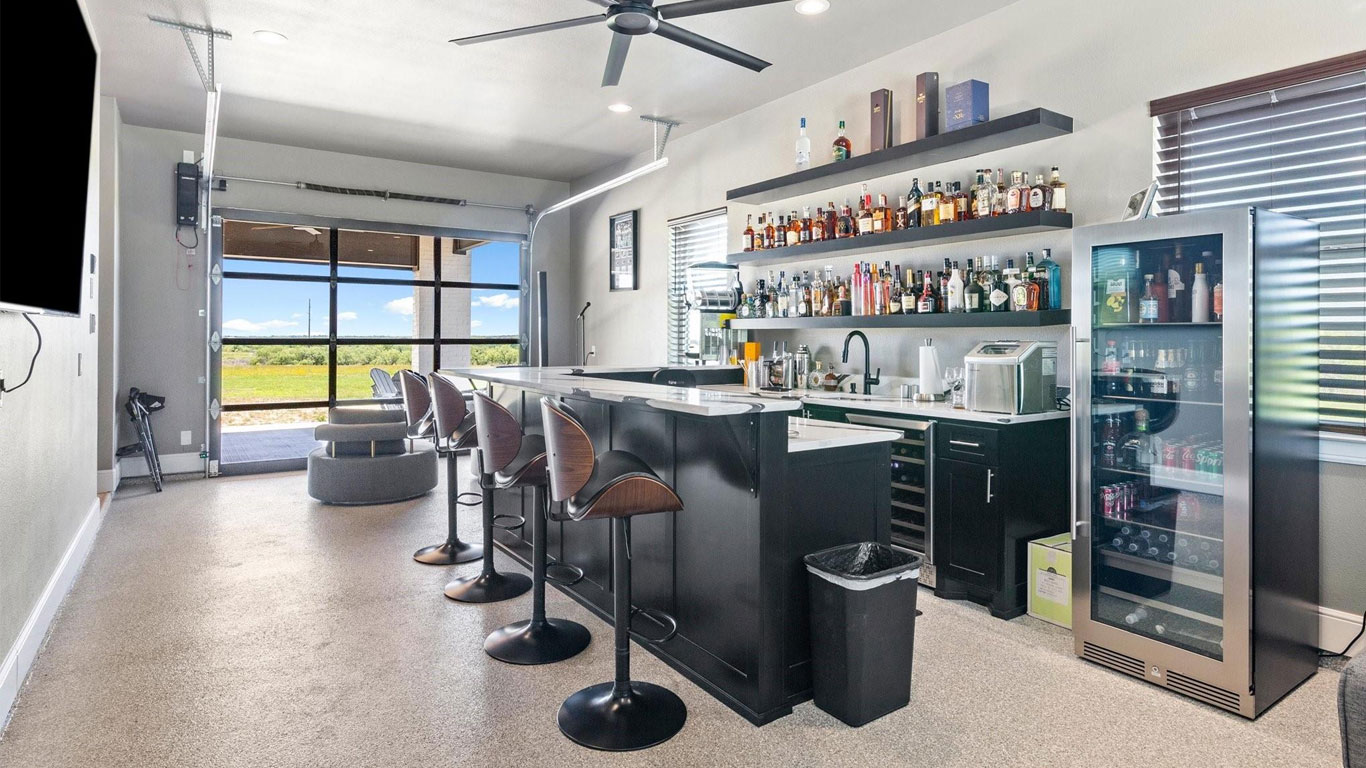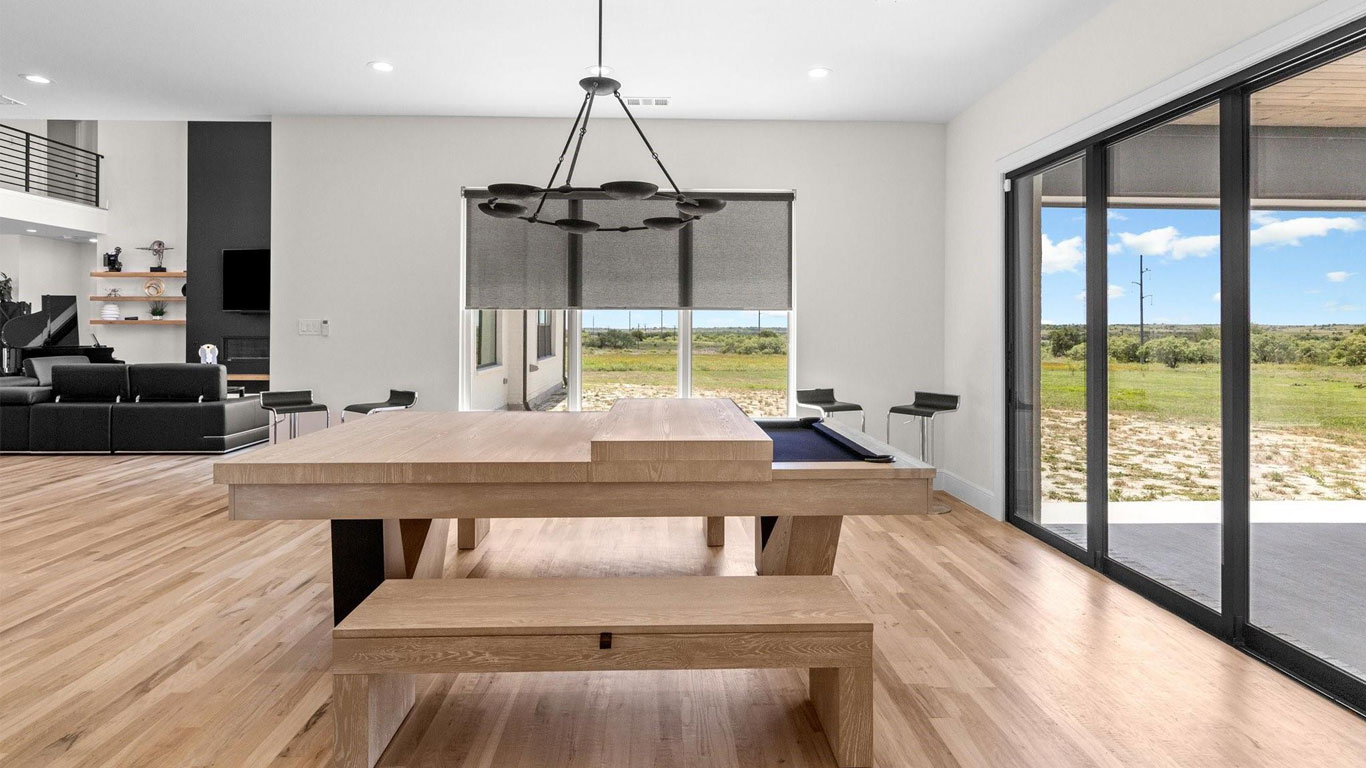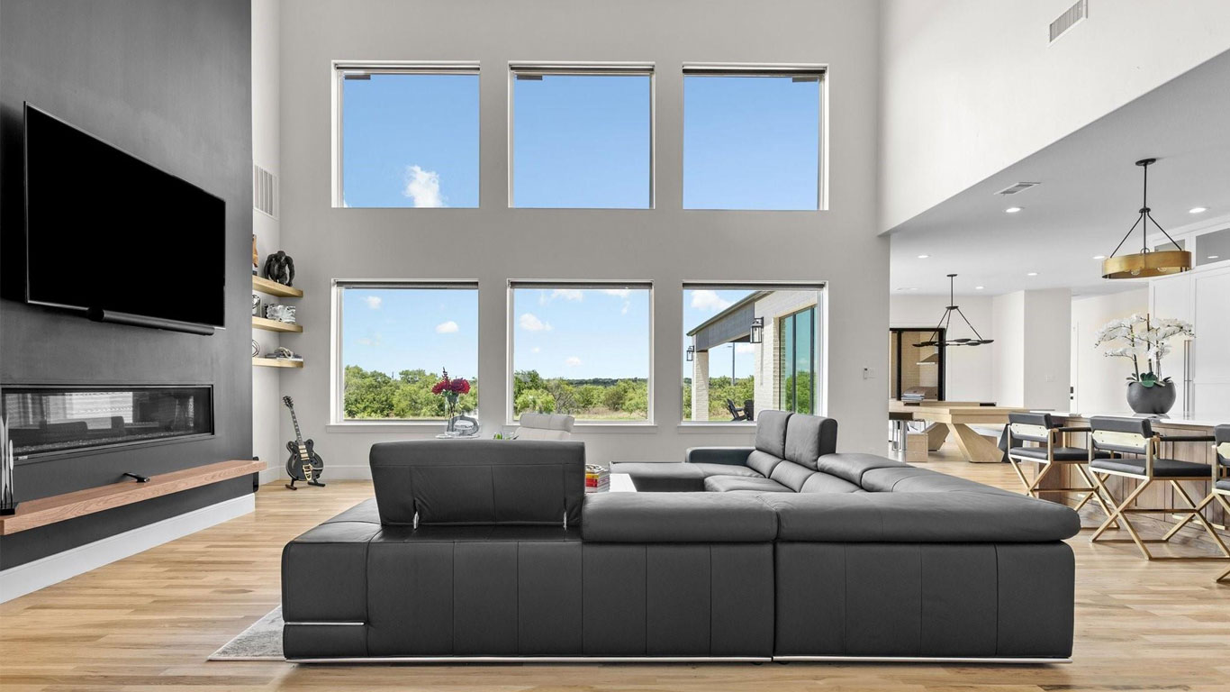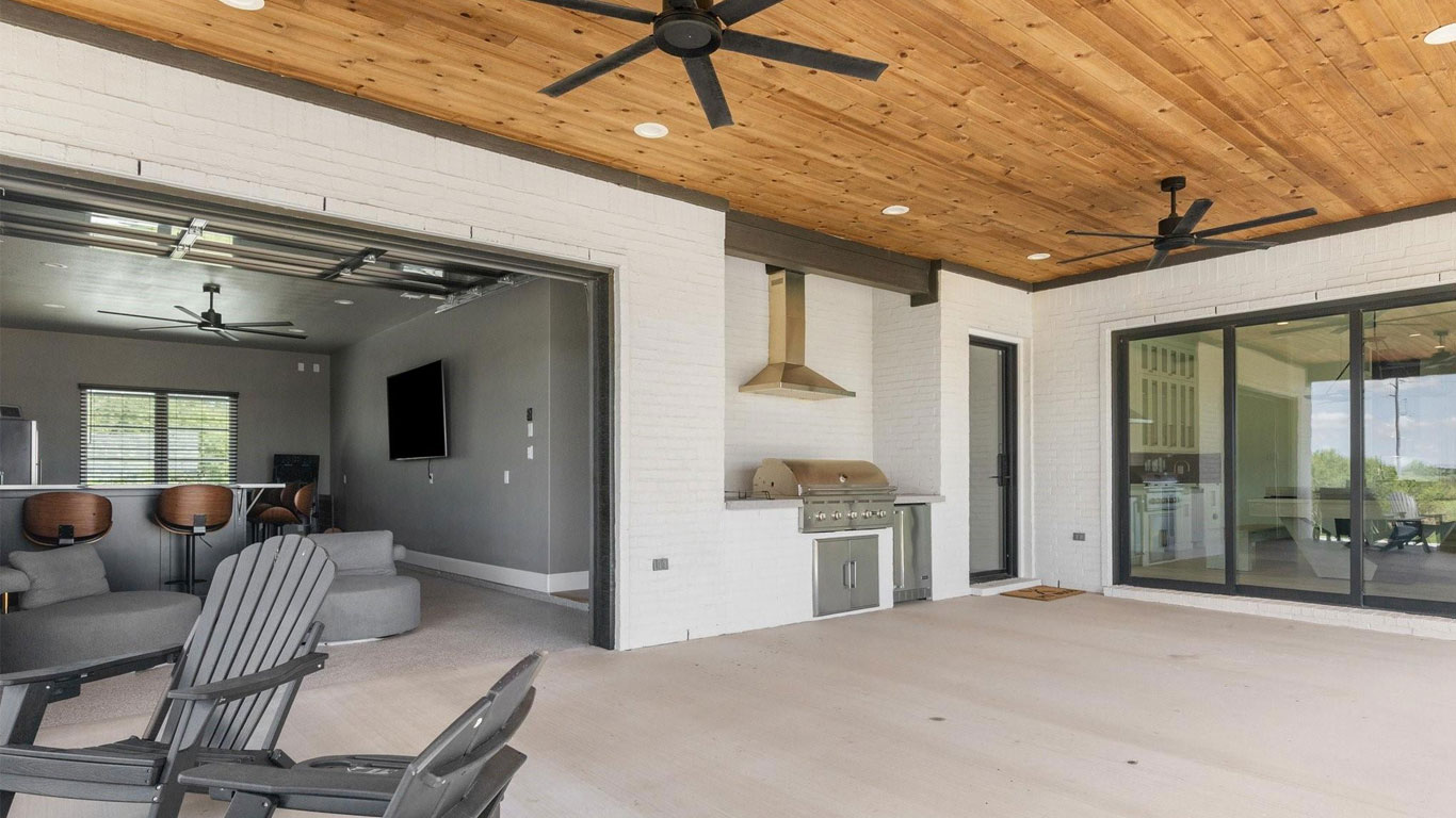 Modern rustic luxury on a 3-acre hilltop lot featuring a stunning designer kitchen, spa-style primary suite, in-home gym with indoor-outdoor bar, full media room, ensuite bedrooms, tornado-safe room, steel roof, hardwoods throughout, and four glass-door garages—all in exclusive La Madera Estates with acclaimed Aledo schools.