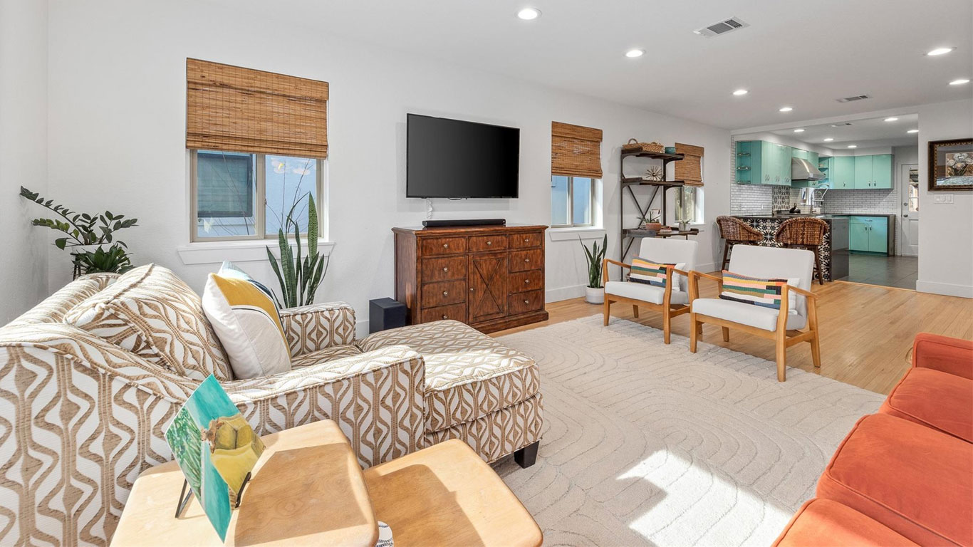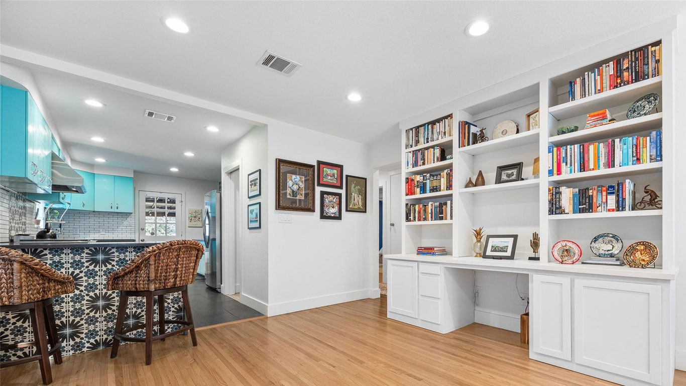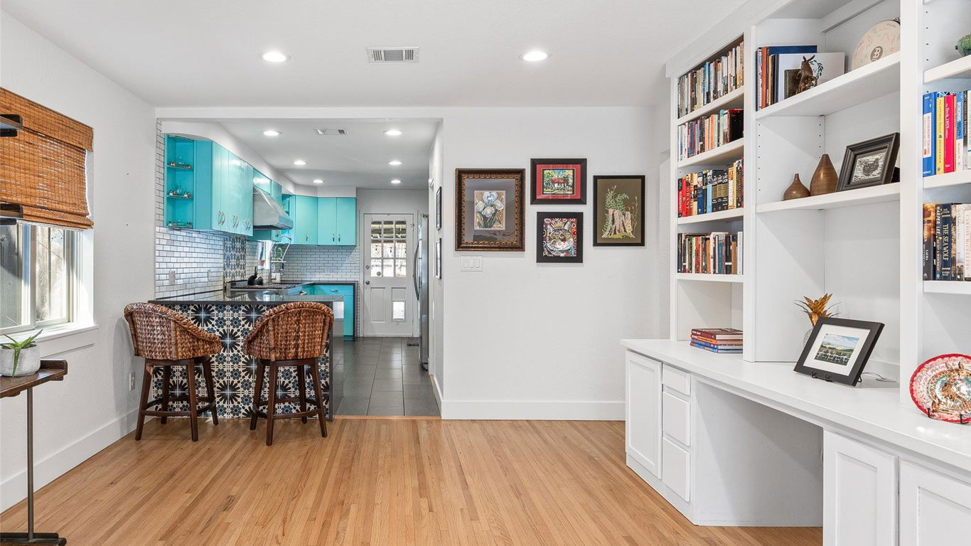 Beautifully restored Arlington Heights mid-century home featuring 2020 down-to-the-studs updates, including refinished white oak floors, Pella windows, authentic metal kitchen cabinets, black quartz countertops, a marble bath with brass fixtures, new HVAC, plumbing, electrical, and tankless water heater. Enjoy a serene flagstone courtyard with water feature, greenhouse, drought-tolerant landscaping, and prime walkability to Dickies Arena—truly move-in ready.